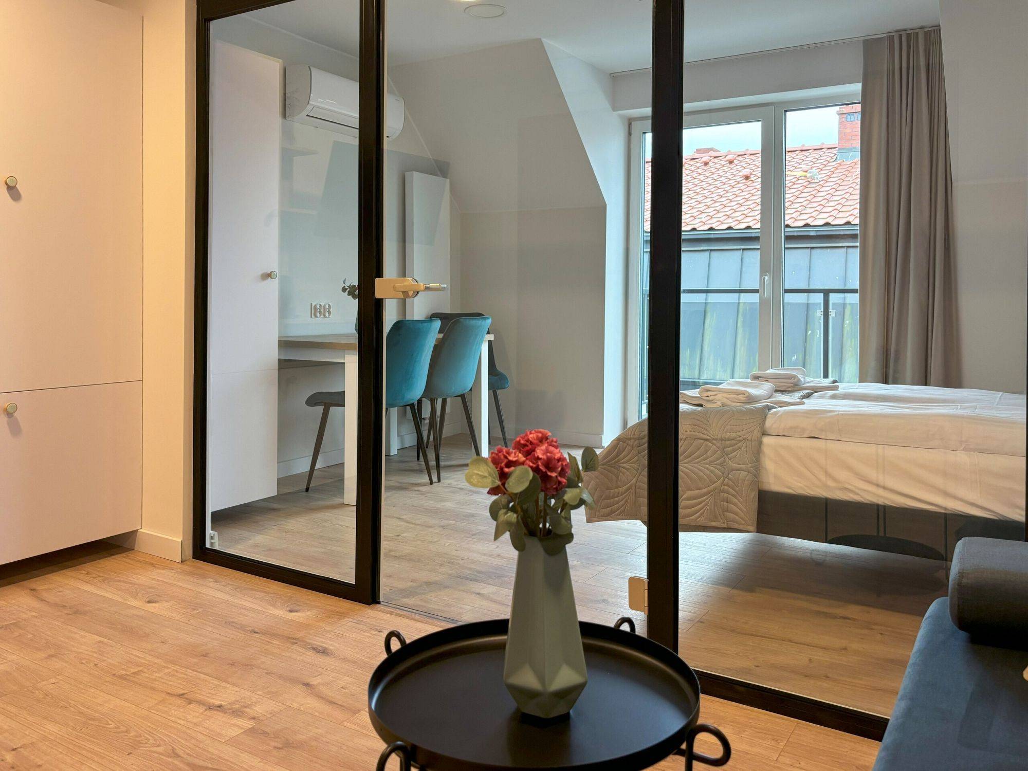 Duże okna z wyjściem na balkon w pokojach i apartamentach pozwalają na obserwację portowego życia miasta, rozciąga się stąd widok na nadmorski kanał, którym płyną łodzie.